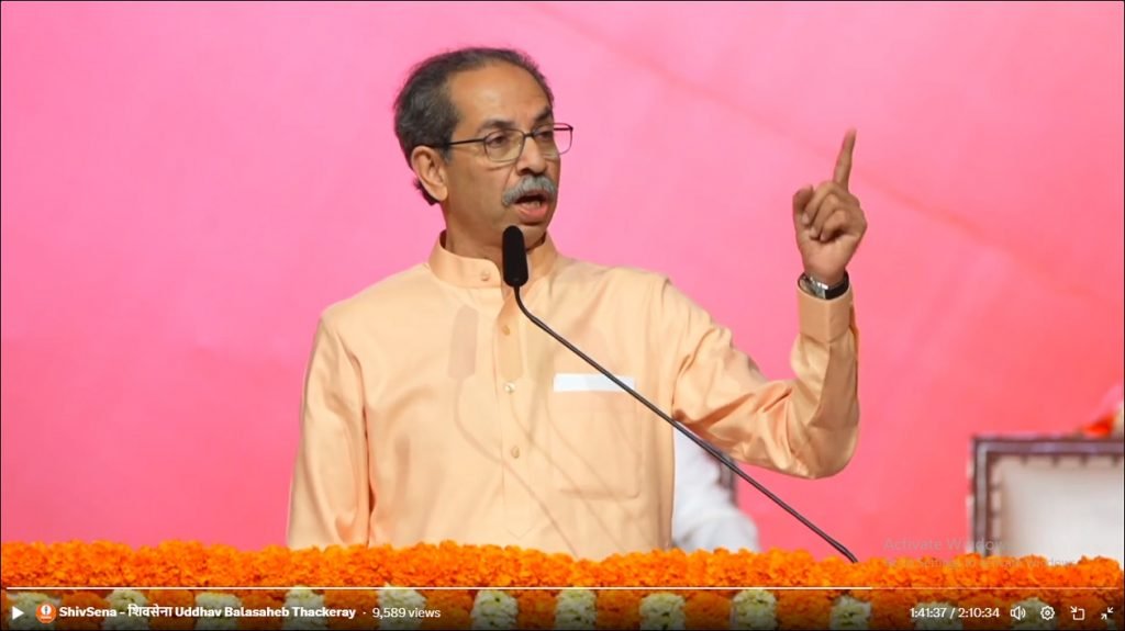 उद्धव ठाकरे यांनी राज्यातील महायुती सरकारवर टीका करताना म्हणाले की, दिल्लीत ते दोन बसलेले दोन दाढीतले राजकारणी व्यापारी बसलेले आहेत, त्यां दोघांचे गुलाम राज्यातल्या सत्तेवर आहेत. त्यांच्या मालकाच्या मित्राला काय पाहिजे ते देण्याचं काम ते सध्या करत आहेत. त्यांनी आपल्यातच गद्दार निर्माण करून आपल्यातच भांडणे लावली. पण आता अशा पद्धतीची भांडणं थांबवायला पाहिजे. काल तर एक गद्दार त्यांच्या मालकाला खुष करण्यासाठी जय गुजरात असे बोलून गेला एका कार्यक्रमात. मालकाला खुष करण्यासाठी किती लाचारीपणा अशी एकनाथ शिंदे यांचे नाव न घेता टीका केली.
