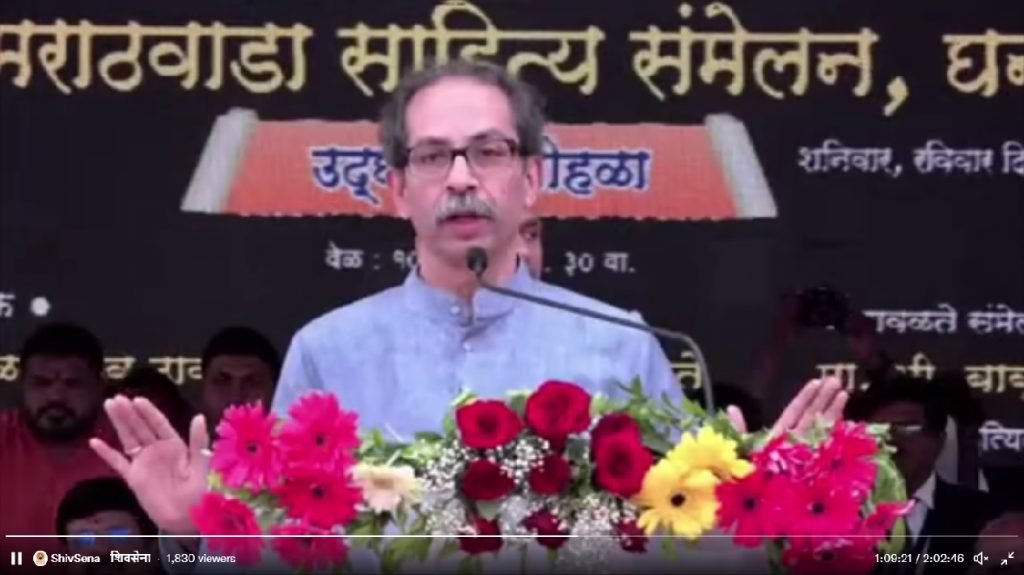 शिवसेना(ठाकरे गट) पक्षप्रमुख आणि माजी मुख्यमंत्री उध्दव ठाकरे यांचे हस्ते जालना जिल्ह्यातील घनसावंगी येथे ४२ व्या मराठवाडा साहित्य संमेलनाचे उद्घाटन आज शनिवारी झाले. यावेळी उद्धव ठाकरे यांनी आपल्या भाषणाद्वारे केंद्रातील मोदी सरकार आणि राज्यातील शिंदे -फडणवीस सरकारवर जोरदार टीका केली. राज्यातील सत्तांतराच्या घडामोडींच्या पार्श्वभूमीवरून उद्धव ठाकरेंनी शिंदे गटाला टोलाही लगावला.