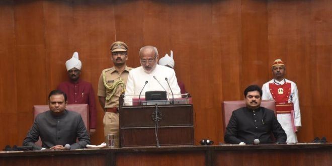 राज्यात महायुती सत्तास्थानी विराजमान झाल्यानंतर या महायुती सरकारचे पहिलेच अर्थसंकल्पिय अधिवेशन पार पडत आहे. या पार्श्वभूमीवर राज्यपाल सी पी राधाकृष्णन विधिमंडळाच्या विधानसभा आणि विधान परिषदेच्या दोन्ही सदस्यांसमोर अभिभाषण करत राज्य सरकारच्या पुढील वाटचालीबाबतच्या धोरणाची माहिती दिली. यावेळी राज्यपाल सी पी राधाकृष्णन पुढे म्हणाले की, शेतकरी, महिला,समाजातील दुर्बल घटकांच्या सक्षमीकरणासाठी त्याचसोबत आरोग्य, रोजगार,उद्योग,पायाभूत सोयी सुविधांचे बळकटीकरणास या शासनाचे प्राधान्य आहे. राज्य शासन सर्व समाज घटकांना सोबत घेऊन सर्वसमावेशक, प्रगतीशील, पुरोगामी व विकसित महाराष्ट्र घडविण्यासाठी काम करीत आहे असे प्रतिपादन केले.