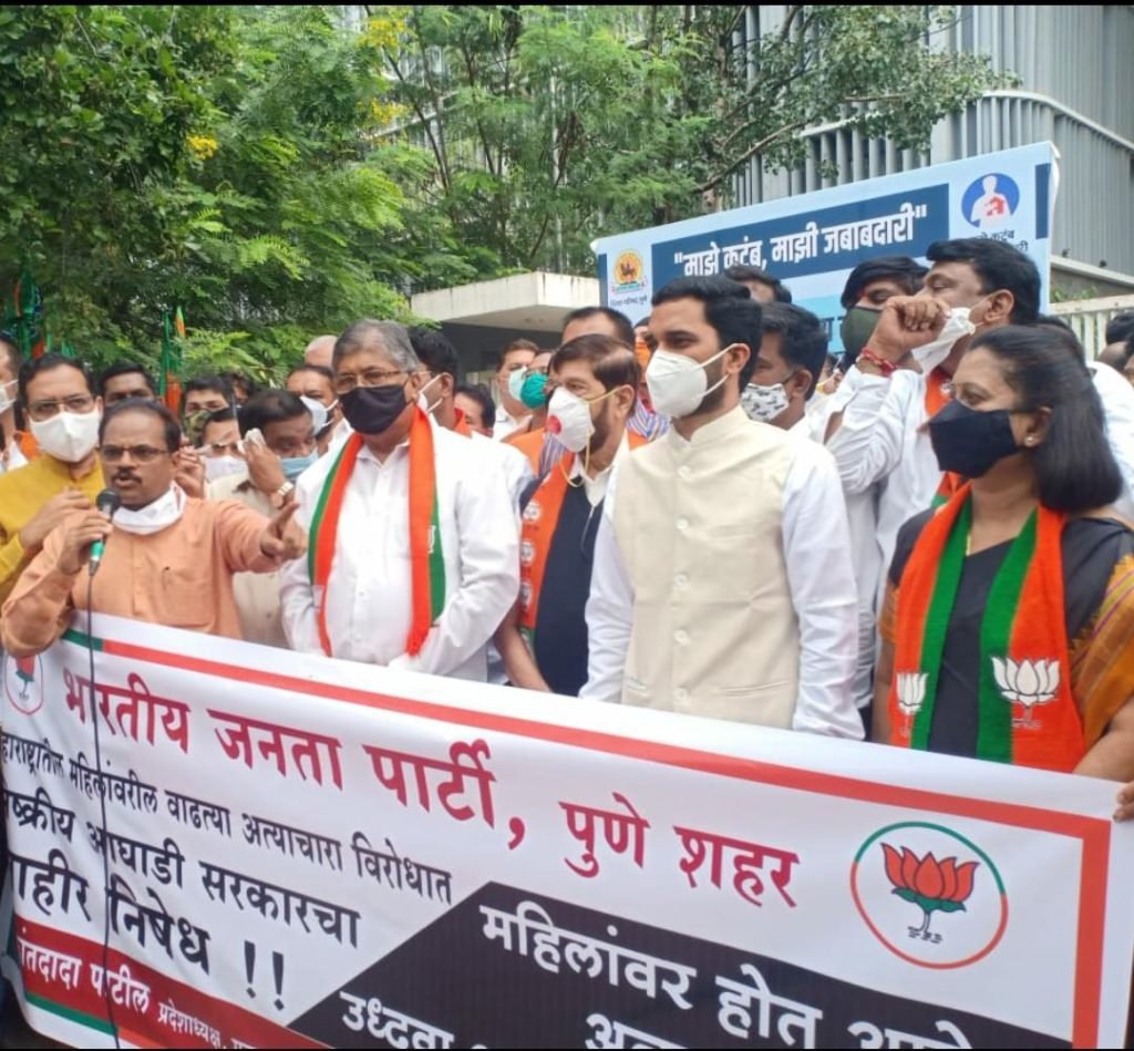 भारतीय जनता पार्टीतर्फे सोमवारी राज्यभर महिलांवरील अत्याचाराच्या विरोधात जोरदार निदर्शने करण्यात आली. या आंदोलनात प्रदेश महिला मोर्चा अध्यक्ष उमाताई खापरे, भाजपा प्रदेश सरचिटणीस आ . देवयानी फरांदे, चंद्रशेखर बावनकुळे, ज्येष्ठ नेते गिरीश महाजन, प्रदेश उपाध्यक्ष चित्रा वाघ, आशीष शेलार, मुंबई अध्यक्ष आ.मंगलप्रभात लोढा तसेच पक्षाचे प्रदेश स्तरावरील प्रमुख पदाधिकारी, लोकप्रतिनिधी सहभागी झाले होते.