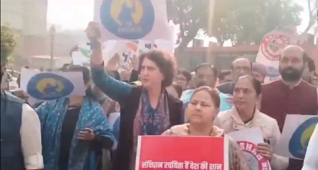 केंद्रीय गृहमंत्री अमित शहा यांच्या आंबेडकरी वक्तव्याविरोधात काँग्रेस खासदार प्रियांका गांधी वड्रा यांच्यासह इतर भारतीय ब्लॉक खासदारांनी शुक्रवारी दिल्लीतील विजय चौकात निदर्शने केली.