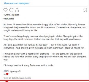विराट कोहली यांनी आपल्या इन्स्टाग्रामवर यासंदर्भात घोषणा करताना म्हणाला की. मी कसोटी क्रिकेटमध्ये पहिल्यांदा बॅगी ब्लू घालायला १४ वर्षे झाली आहेत. प्रामाणिकपणे सांगायचे तर, या फॉरमॅटमध्ये मला असा प्रवास करावा लागेल याची मी कधीच कल्पना केली नव्हती. याने माझी परीक्षा घेतली, मला आकार दिला आणि मला आयुष्यभर सहन करावे असे धडे शिकवले, असेही इन्स्टाग्रामवर आपले मनोगत व्यक्त केले.