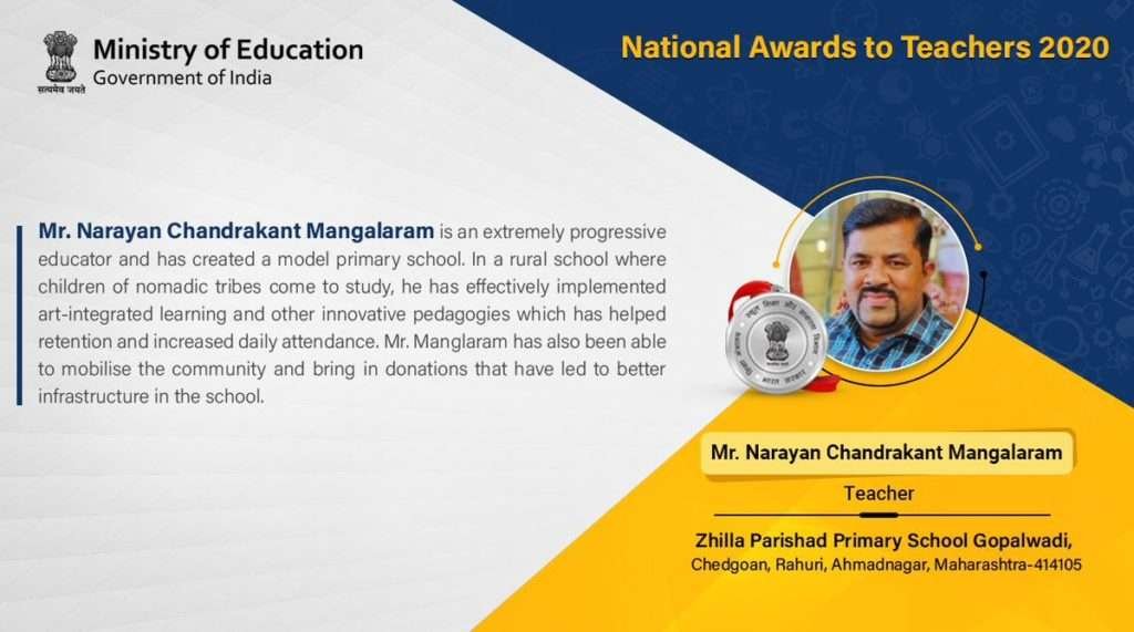 अहमदनगर जिल्हयाच्या राहुरी तालुक्यातील गोपाळवाडी (चेडगांव) जिल्हा परिषद प्राथमिक शाळेचे उपक्रमशील शिक्षक नारायण मंगलाराम यांनी दिलेल्या उल्लेखनीय योगदानासाठी त्यांना या मानाच्या पुरस्काराने सन्मानित करण्यात आले. गेल्या १७ वर्षांपासून कार्यरत मंगलाराम हे नवनवीन पद्धतींचा अवलंब करून विद्यार्थ्यांना शिकवतात. त्यांनी ई-लर्निंग पद्धतीचा अवलंब केला असून शाळेतील प्रत्येक वर्ग डिजीटल केला आहे. मंगलाराम यांनी सुरु केलेल्या ‘व्हर्चुअल क्लासरूम’च्या माध्यमातून या शाळेतील विद्यार्थी हे परदेशातील शिक्षकतज्ज्ञांशी संवाद साधतात. ‘स्काइप इन क्लासरूम’ या उपक्रमाद्वारे या शाळेतील विद्यार्थ्यांनी २५ देशांतील २०० पेक्षा अधिक शाळांमधील विद्यार्थ्यांसोबत शैक्षणिक देवाण-घेवाण केली आहे. त्यांनी दक्षिण कोरिया मधल्या शाळेबरोबर ‘कल्चरल बॉक्स’ हा सांस्कृतिक देवाण-घेवाणीचा उपक्रम राबविला आहे.