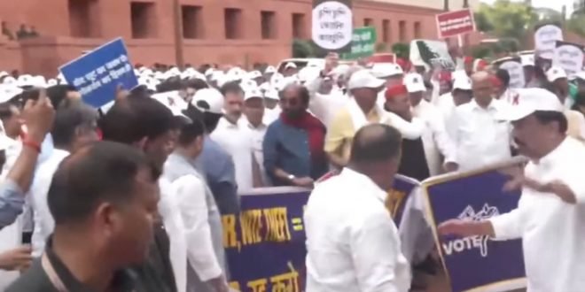 सोमवारी राष्ट्रीय राजधानीत प्रचंड नाट्यमय घडामोडी घडल्या इंडिया आघाडीच्या सुमारे ३०० विरोधी खासदारांनी ‘मत चोरी’च्या आरोपावरून निवडणूक आयोगाच्या कार्यालयाकडे कूच केली आणि निवडणूक आयोगावर भाजपाशी संगनमत करून त्यांच्या निवडणूक उद्दिष्टांना साध्य करण्याचा आरोप केला. काँग्रेस नेते राहुल गांधी यांच्या नेतृत्वाखाली मोर्चा पोलिसांनी मध्यभागी रोखला, ज्यामुळे समाजवादी पक्षाचे प्रमुख अखिलेश यादव यांच्यासह अनेक खासदार बॅरिकेड्सवरून उड्या मारत पोलिसांनी रोखलेला मोर्चा यशस्वीरित्या पार पाडण्याचा प्रयत्न केला.