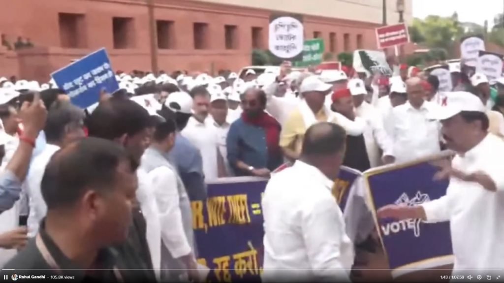 सोमवारी राष्ट्रीय राजधानीत प्रचंड नाट्यमय घडामोडी घडल्या इंडिया आघाडीच्या सुमारे ३०० विरोधी खासदारांनी ‘मत चोरी’च्या आरोपावरून निवडणूक आयोगाच्या कार्यालयाकडे कूच केली आणि निवडणूक आयोगावर भाजपाशी संगनमत करून त्यांच्या निवडणूक उद्दिष्टांना साध्य करण्याचा आरोप केला. काँग्रेस नेते राहुल गांधी यांच्या नेतृत्वाखाली मोर्चा पोलिसांनी मध्यभागी रोखला, ज्यामुळे समाजवादी पक्षाचे प्रमुख अखिलेश यादव यांच्यासह अनेक खासदार बॅरिकेड्सवरून उड्या मारत पोलिसांनी रोखलेला मोर्चा यशस्वीरित्या पार पाडण्याचा प्रयत्न केला.