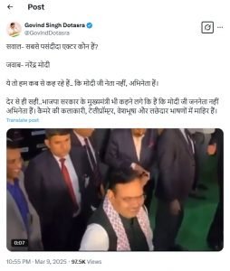 यावर प्रतिक्रिया देताना राजस्थान काँग्रेसचे अध्यक्ष गोविंद सिंह दोतासरा यांनी एक्स वर सांगितले, “आम्ही बऱ्याच काळापासून हे सांगत आहोत… की मोदीजी नेते नाहीत तर अभिनेते आहेत. जरी उशिरा का होईना, भाजपा सरकारचे मुख्यमंत्री देखील मोदीजी सार्वजनिक नेते नाहीत तर अभिनेते आहेत असे म्हणू लागले आहेत. ते कॅमेरा कौशल्य, टेलीप्रॉम्प्टर, पोशाख आणि फुलांच्या भाषणांमध्ये तज्ज्ञ आहेत.”